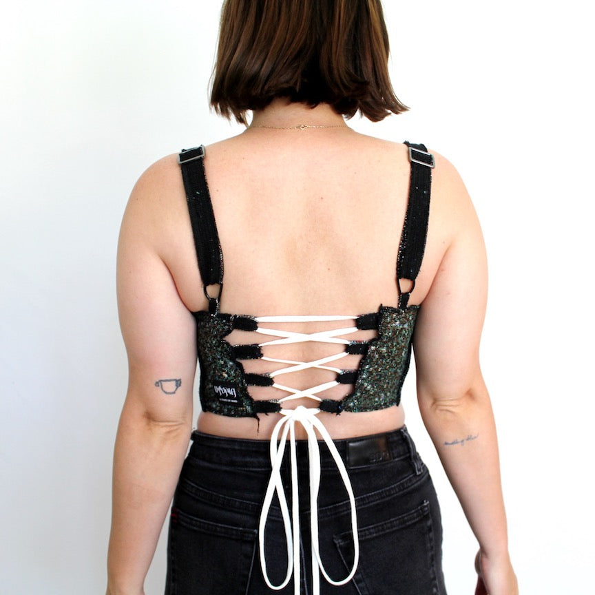 Please note crop tops are adjustable. The lace up can be tightened to be made smaller and loosened to be made larger! Best fits sizes medium to size large depending on how loose/tight you make the back lace :)